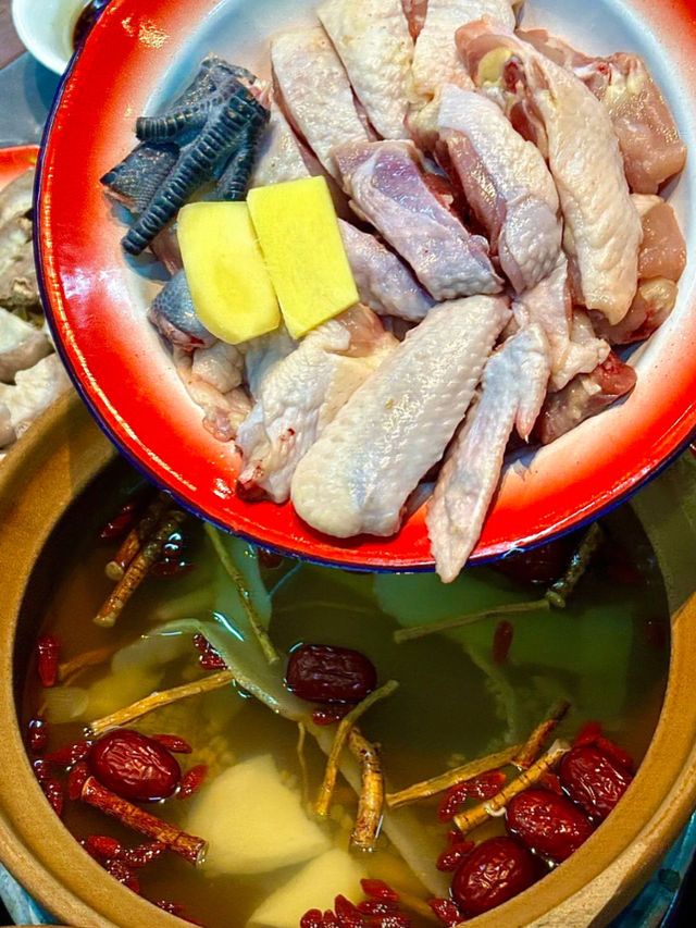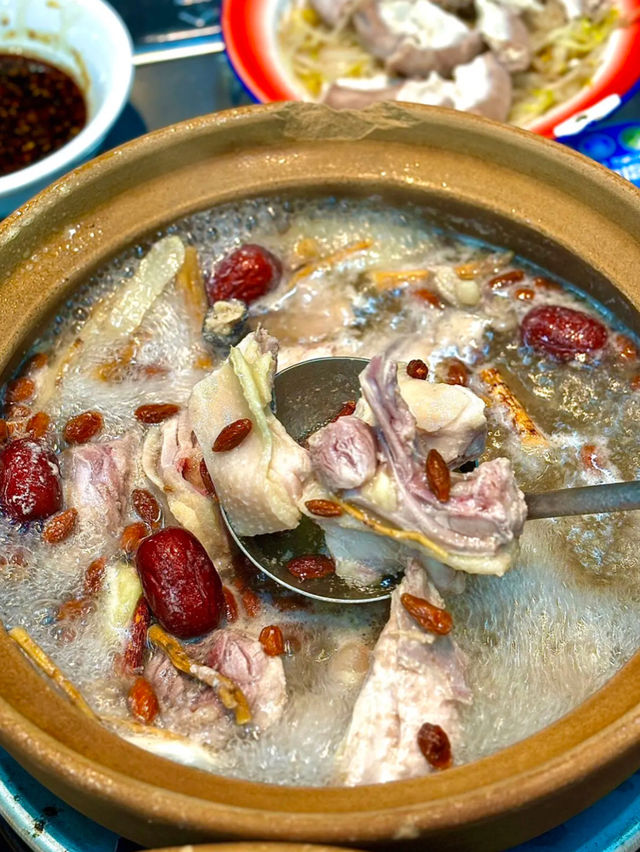 The weather is starting to cool down, giving a taste of autumn. It's time to enjoy a nourishing chicken pot meal. Although this shop isn't very large, it has a simple and elegant decor, with many colorful introductions, recipes, and ingredients inside. Traditional Ginger Vinegar Egg While waiting for the chicken pot, enjoy the traditionally secret-made, sweet and sour ginger vinegar pork trotters. Each bite is filled with collagen. Herbal Chicken Pot The soup base includes codonopsis, red dates, goji berries, and five-fingered peach, paired with free-range chicken. The soup is delicious and nutritious, and the chicken is tender and bouncy, making it very healthy. Fortune Chicken Pot It includes sand ginger and onions paired with freshly stir-fried free-range chicken, then cooked at high temperature on the stove. The flavors are particularly rich when eaten.