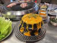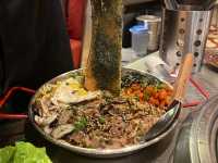 In recent years, Korean BBQ restaurants have sprung up all over Shenzhen. This time, I visited a popular BBQ spot with a traditional Korean street stall decor, complete with iron barrels and staff to help grill the meat. The restaurant specializes in beef and pork offal, but I found the prices a bit high and the offal not as fatty and delicious as expected, leaving me somewhat disappointed. There are better options available for the same price. However, the cooked dishes like steamed egg with corn and beef marrow rice were surprisingly good. 😆 Charcoal Grilled Black Beef Offal Platter The beef heart was tender and smooth, really good! The beef tripe was a bit dry and not juicy enough, and the beef intestines were too tough to chew... The beef tongue was delicious! Very juicy with a strong beef flavor, but it was cut too thin and the portion was too small. Steamed Egg with Corn Very tasty, with a thick corn sauce covering the eggs. The eggs were fragrant and smooth, sweet and appetizing! Beef Marrow Rice Large chunks of beef marrow melted into the rice, making the fried rice rich and flavorful. Mixing it with kimchi, seaweed, and beef made it even more delicious! The oily richness filled my mouth! The portion is huge, enough for 3-4 people, very filling and worth the price.