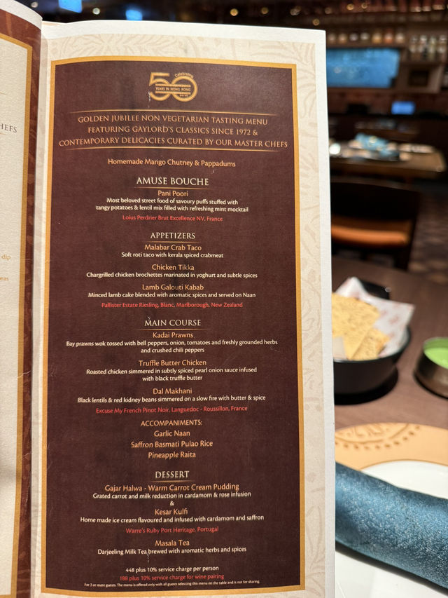 Gaylord 50th Anniversary Celebration Tasting Menu, really elegant enough The menu is beautifully designed, looks very ceremonial, price $ 448 per person plus one, ingredients and wine is quite emphasized. First, the Amuse Bouche's Pani Poori, is actually an Indian street snack, the skin is crispy, the filling is sour and sweet, quite appetizing, followed by the Appetizer, the Malabar Crab Taco, the crab meat is very fresh, the Roti cake is soft enough, with spices, the taste is quite tasty, the meat is tender. Main Course is the highlight! For the side dishes, the Garlic Naan was fluffy enough, the Saffron Basmati Pulao Rice was grainy with a hint of saffron, and the Pineapple Raita was sweet and sour, quite refreshing. The final Dessert is Gajar Halwa, which is a carrot dessert, sweet but not greasy, smooth, plus the aroma of Cardamom and Rose, Kesar Kulfi is saffron ice cream, sweet and smooth texture! The quality of the food in this Tasting Menu is quite good, each dish is carefully prepared, rich in flavors, fresh ingredients, definitely worth a try! 📍Jue Lek Indian Restaurant 5/F, Prince Group Centre, 12A Peking Road, Tsim Sha Tsui #JueLekIndianRestaurant #Indianfood #indiancuisine #hkfoodie #Tsim Sha Tsui Food #Exquisite #curry #spicy