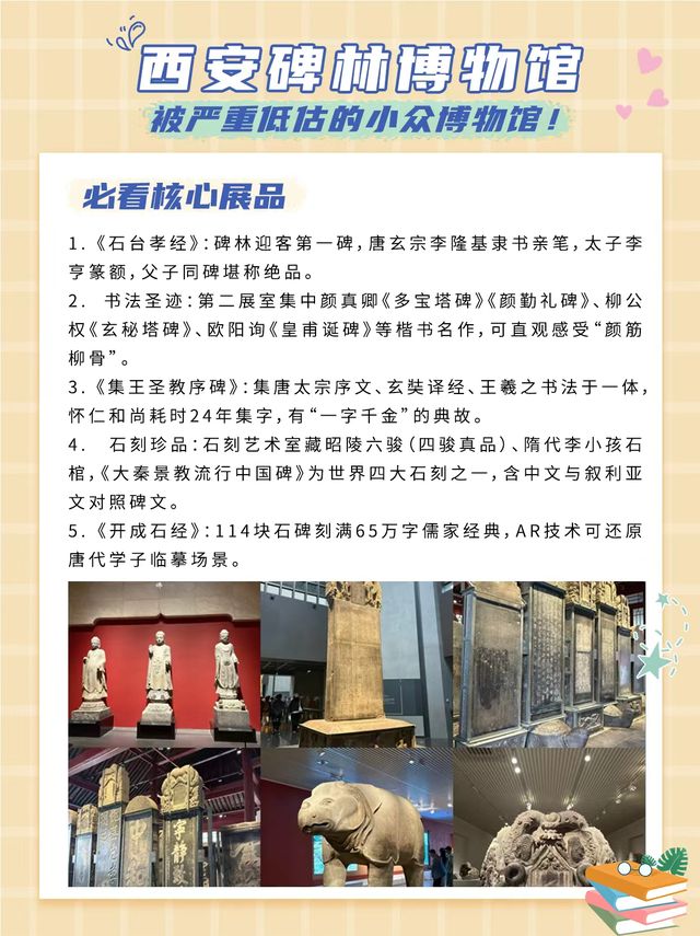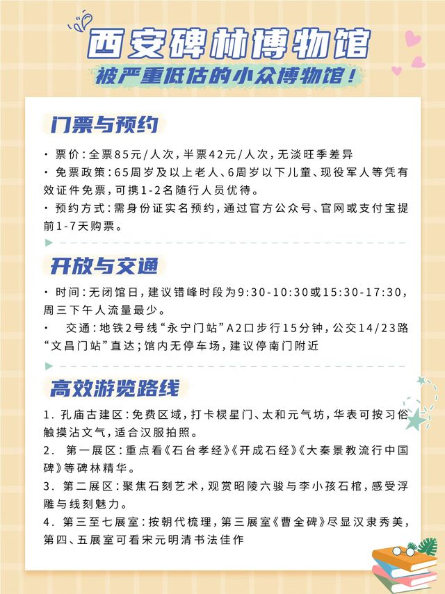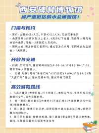 Just returned from the Xi'an Beilin Museum, personally experienced and here to guide you through this "Stone Library" step by step. ✅ Key Facts about Beilin Museum 1. The museum's name was inscribed by Guo Moruo, with the core concept being "establishing the museum through steles, passing down history through steles." 2. "China's earliest calligraphy art museum," housing thousands of stone steles from the Han to Qing dynasties. 3. China's largest "stone library," with national treasures such as the Kaicheng Stone Classics and the Nestorian Stele. ✅ The Beilin Museum scenic area is divided into four parts: 1. Confucius Temple Site (including Lingxing Gate, Pan Pool, Dacheng Hall) 2. Stele Forest Exhibition Area (core stele display area) 3. Stone Carving Art Room (e.g., original Zhaoling Six Steeds) 4. Calligraphy Art Experience Area (where you can try rubbing and calligraphy copying) ✅ Recommended Tour Route Confucius Temple Site — Stele Forest Exhibition Area — Stone Carving Art Room — Calligraphy Art Experience Area (see image 2) 1. Arrive before 9 AM, start with the Confucius Temple Site; the red walls and ancient buildings are less crowded and great for photos, the symmetrical composition of Lingxing Gate and Pan Pool is stunning; 2. Walk from the Confucius Temple to the Stele Forest Exhibition Area, focus on the "First Exhibition Room" (Kaicheng Stone Classics) and the "Fourth Exhibition Room" (steles by famous calligraphers like Yan Zhenqing and Liu Gongquan). Renting an electronic guide device (30 RMB each) is recommended to avoid missing the stories behind the steles; 3. After the Stele Forest Exhibition, visit the Stone Carving Art Room to see the Zhaoling Six Steeds up close (4 originals, 2 replicas) and appreciate the charm of Tang dynasty stone sculptures; 4. Finally, go to the Calligraphy Art Experience Area, spend 30-50 RMB to try hand-made rubbings (which you can take home as souvenirs), perfect for bringing kids to experience traditional culture. ✅ Opening Hours Peak Season (March 1 - November 30): 8:00 AM - 6:00 PM, last entry at 5:15 PM Off Season (December 1 - February 28): 8:00 AM - 5:30 PM, last entry at 4:45 PM * No night sessions, recommend reserving 3-4 hours for a full visit ✅ Tickets 1. Adult Ticket: 65 RMB per person (book online 1 day in advance to save 5 RMB compared to on-site purchase) 2. Student Ticket (undergraduate and below): 32 RMB per person (student ID required) 3. Free for seniors over 65 and children under 1.2 meters (seniors must bring ID) * Combo Ticket Recommendation: Beilin Museum + Xi'an City Wall for 100 RMB (save 30 RMB compared to buying separately, ideal for a one-day tour of the ancient city wall and Beilin)