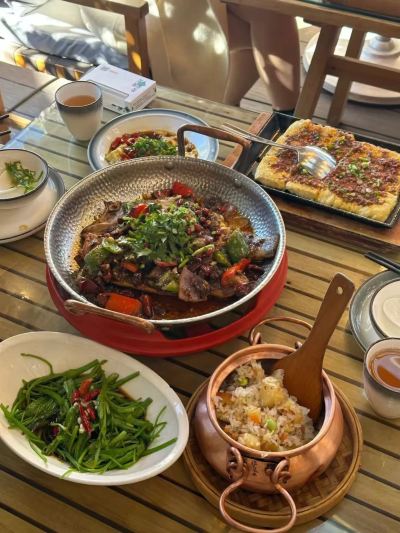 This restaurant is located in Shuhe Ancient Town. I discovered it by accident. The environment really attracted me. It is the best restaurant I have been to in Lijiang. It is a garden-style courtyard restaurant with very good decoration. There are many flowers, which are especially suitable for taking photos and checking in. With the blue sky and white clouds, it is another beautiful scenery! I went there with my friends. The dishes are delicious and fragrant. The Pu'er tea braised pork is the MVP. It is especially good with small pot rice. The water lily and local specialty vegetables taste pretty good. The restaurant environment is very good and has a great atmosphere. There are many flowers of various colors in the courtyard. With some drinks and Pao Luda, there are also singers next to it. It is especially great to eat and chat with friends. Hahaha, I will go again next time I have a chance!