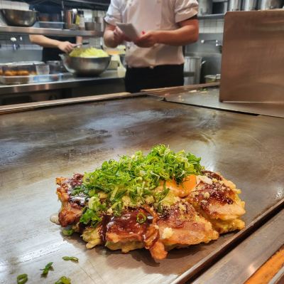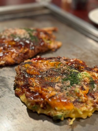 Okonomiyaki (Umeda Sky Building Branch) is located at 1-1-90 Oyodonaka, Kita-KuUmeda Sky Bldg. B1F Takimi Koji 531-0076, Osaka City, Osaka Prefecture. When we arrived, we saw many tourists dining there. There were several kinds of Okonomiyaki on the menu. The staff were very friendly and introduced them to us in English. The fried Okonomiyaki was hot and delicious, and the food was also crispy and had a good texture.