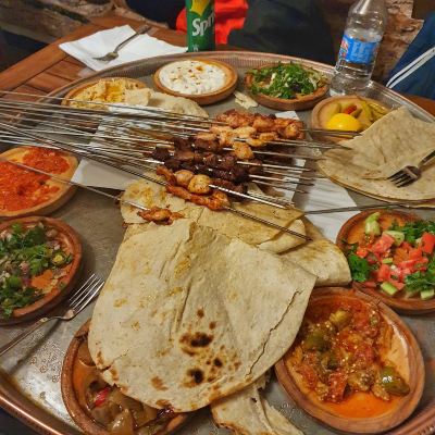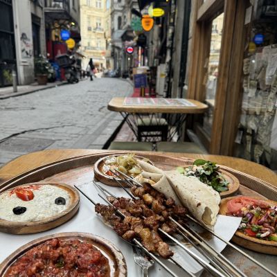 It looked incredibly lavish, with a wide variety of meats to choose from depending on the number of people. The lamb and chicken skewers we ordered were both delicious and of excellent quality. Served with various side dishes wrapped in flatbread, they were a wonderful combination of flavors. Eating all nine different side dishes was very satisfying. The old street was also very beautiful, and the atmosphere of enjoying skewers at the small tables outside was fantastic! The prices were clearly marked, so they didn't rip off tourists – highly recommended!