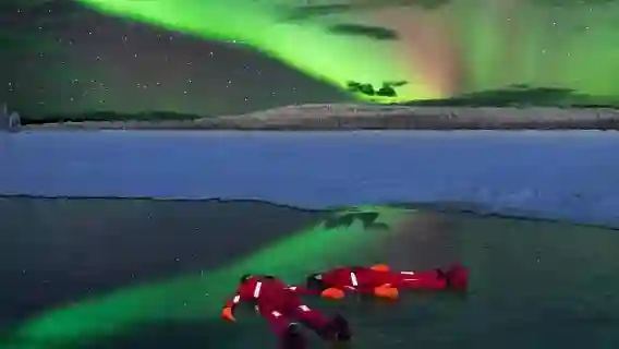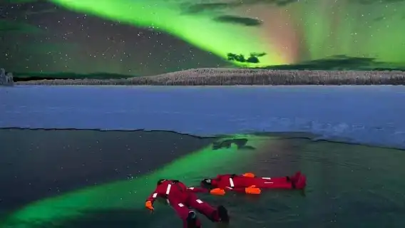 Float on a frozen lake in a warm floating suit, immersed in the Northern Lights of Lapland.