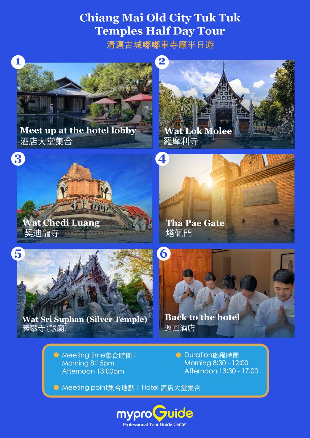Visit Wat Lok Molee (Wat Lok Moli), one of the ancient temples in Chiang Mai, featuring a Lanna-style vihara. Proceed to Wat Chedi Luang (Watchediluang Varaviharn), the home of the Emerald Buddha. Explore the bustling shops and local street markets around Tha Phae Gate. Capture beautiful photos at the renowned Wat Srisuphan (Wat Sri Suphan), also known as the Silver Temple, famous for its exquisite silver designs and decorations. Your guide will take care of your transportation and historical insights.
