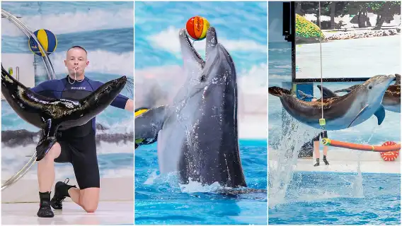 Dolphin Talent Show - Watch the clever dolphins jump high, spin in circles, sing, and interact with their trainers in a hilarious way.