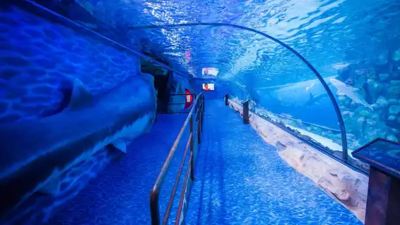 Discover unparalleled wonders at the Dubai Aquarium, a centerpiece of Dubai Mall. Home to 30,000  aquatic animals, including a 40-year-old giant crocodile, the world's largest suspended aquarium beckons with a 10 million-liter tank. Enjoy access to an underwater zoo, a walk-through tunnel, and a thrilling snorkeling cage for an unforgettable family experience. Dive into the extraordinary at Dubai Aquarium