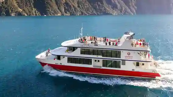 Classic fjord cruise (1 hr 45 min): Board the catamaran sightseeing boat for a close-up view of Mitre Peak, waterfalls, and glacial rock walls.