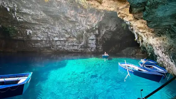 Set sail on a boat ride through the crystal-clear waters of Melissani Cave Lake