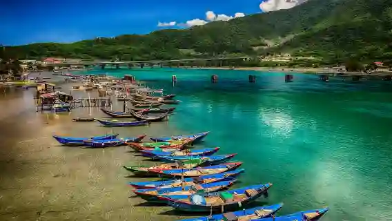 Capture the beauty of the Lap An Lagoon with its white sandy path and boats