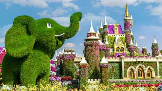 Stroll through themed displays, floral castles, and creative structures at Dubai Miracle Garden